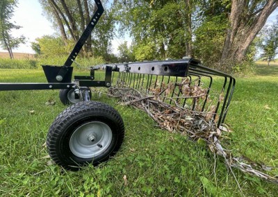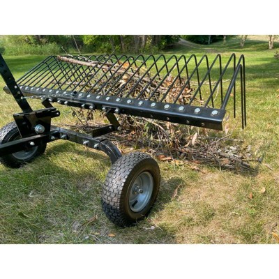 This landscaping rake covers a working area of 72 inches, helping you cover a lot of ground, which is a great option if you have a larger yard or acreage. The rake comes with a pin hitch to attach to your ATV, UTV, or utility tractor. There are 2 large, 15-inch pneumatic tires that can easily maneuver across a variety of terrain.