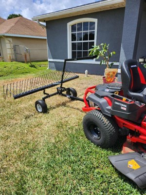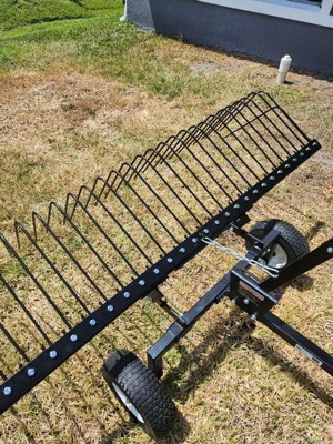 [This review was collected as part of a promotion.] This Landscape rake tow behind is solid! It seems sturdy and versatile in that it works both with dried grass as well as pine cones or other debris like sticks. The assembly was straight forward and took about 30 minutes. The rake hooks up very easily to our zero turn tractor and seems to be a real helper if you have an acre or more.
