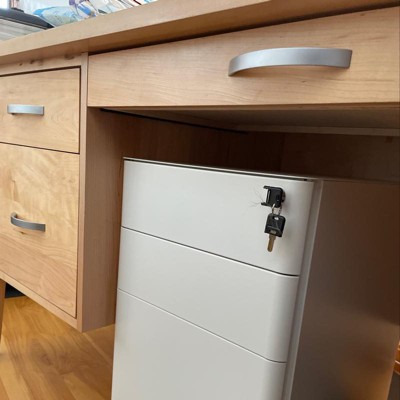 Clean lines and hidden pulls make this cabinet with full extension drawers a nice addition to your office. Well hidden casters roll nicely. Plus it fits under a desk. Only negative, bottom file drawer does not fit regular size file folders. Would have given 5 stars.
