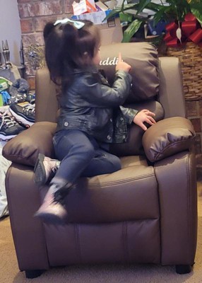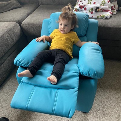 Comfortable seating is a must for all ages and your little ones will enjoy having a "grown up" chair all their own. This generously padded recliner chair for kids is a perfect spot for kids to watch TV, draw on a light-up tracing pad, fine tune their motor skills playing video games or quietly read their favorite book. This kids recliner features a built-in cup holder to help prevent spills and free up busy hands. Is your little munchkin of the four-legged variety? This recliner is the ideal spot for them to curl up with their favorite toy and chew sticks or dog bicuits can be held in the cup-holder to reward good behavior. Safety means everything when it comes to those most important to you. This sturdy kids recliner has a solid hardwood frame that holds up to 90 lbs static weight capacity and only reclines when a child is seated and the footrest is pulled out 1". Soft foam padding, raised plastic feet and durable microfiber upholstery round out the all-star roster of this reclining kids chair. Just as night follows day, spills and stains are inevitable when there are kids and pets in the home. Quickly and easily spot clean the upholstery with water and a neutral detergent to keep this push back recliner looking great. This cozy recliner for kids will be a great addition to your living room, child's bedroom or playroom.