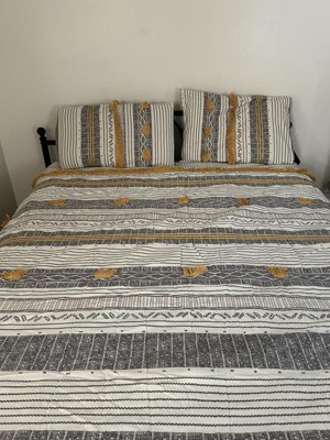 [This review was collected as part of a promotion.] This 3 piece cotton comforter set is so beautiful. I love the embroidery and the yellow and grey colours. I like how the set includes a comforter and 2 pillow shams. It looks so nice in my bedroom. I washed the comforter once and it held up well. The trick is not to dry it fully and it will air dry fluffy. The quality is impeccable.
