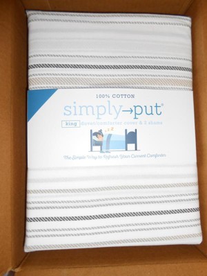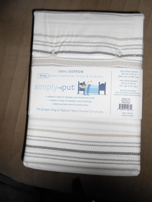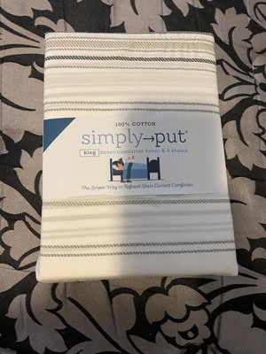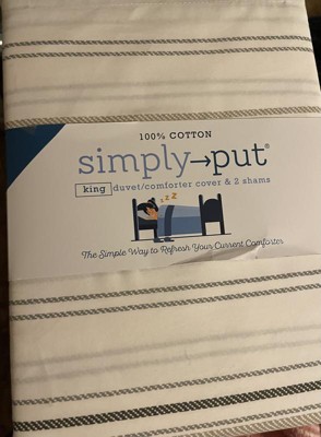 [This review was collected as part of a promotion.] This is the perfect way to change or update your bedding look. The Simply Put 3-PC King Stripe Print Duvet Set comes in a cute package that has everything you need to use your existing blanket or comforter and use the duvet to cover it and "voila", you have a nice, crisp, and clean new looking comforter. So easy to slip the duvet over your comforter, tie the ends inside to hold it in place, and button the duvet to cover the comforter. The pillow shams are zippered so the pillows stay covered and the whole cover and shams come in a neat, buttoned case. I love how easy this is to change up the look of any room. Simply Put is on point!