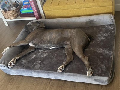 My 100pd cane corso loves this jumbo plus bed, she can actually spread out all the way with room to spare! It’s very soft and the entire cover is washable (including headrest). However I wish it was waterproof, we’ve only had it for a month and the memory foam is already turning yellow and has dog hair on it. It is pricey but it’s the right size stylish and comfy.
