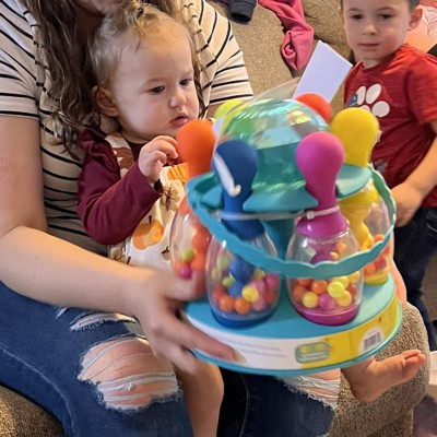 Got this for our 1 year old’s birthday. It’s super fun for her and her older siblings ( ages 6 & 8) enjoy playing with it too. I like that you can shake the pins and the ball is easy to roll. I also enjoy that it all pops into the carrying case to make cleanup easy.