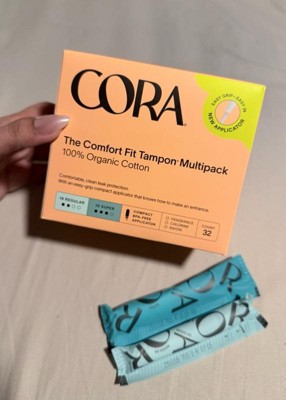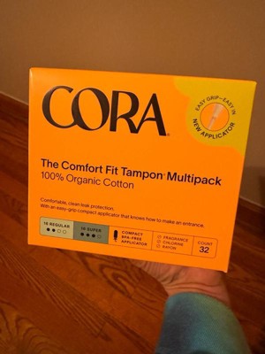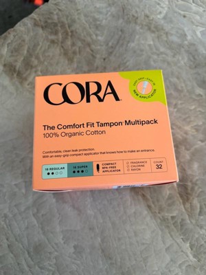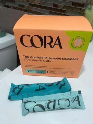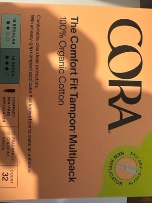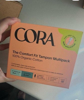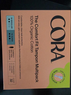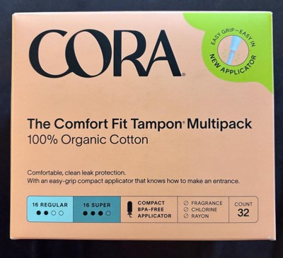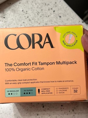 [This review was collected as part of a promotion.] CORA-The Comfort Fit Tampon Multipack. Comes in a pack of 32. 16 super and 16 regular. These are 100% Organic Cotton, comfortable and thick enough for clean leak protection. Easy to grip shape and easier to use applicator. Very durable and lasted a good amount of time, until it was time to change.