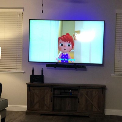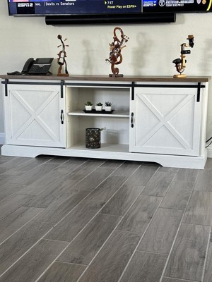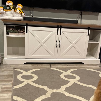 Saracina Home’s Clarabelle Double Sliding X Barn Door 70” TV Stand is the homey farmhouse pick-me-up you’ve been looking for. Two sliding X-front barn doors give you the freedom to choose what’s on display and what stays out of sight. Place media components, books, and decorations on any of the three adjustable shelves, and keep cables organized with the convenient cord management ports. Strong powder-coated steel hardware and accents add just the right amount of rustic finesse to the piece. The low profile makes for a down-to-earth silhouette that looks just right as a living room storage console or even a dining room sideboard.