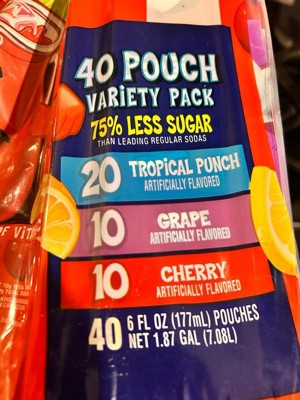 - Every box contains 10 tropical punch, 10 grape and 10 cherry artificially flavored drink pouches