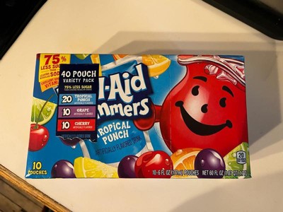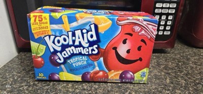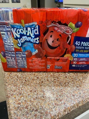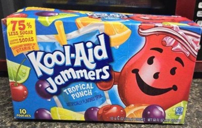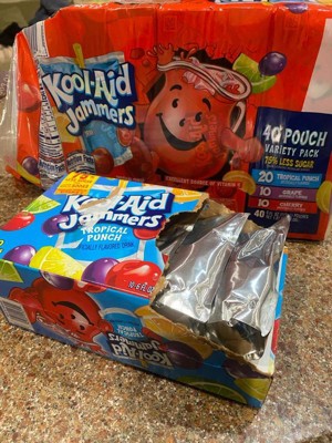 Kool-Aid Jammers Artificially Flavored Drink Variety Pack delivers fun with a sweet drink kids love! Our delicious variety pack contains 30 pouches, including 10 tropical punch, 10 grape and 10 cherry artificially flavored drinks. They contain 55% less sugar than leading regular sodas (per 12 fl oz, this product 10g total sugar, leading regular sodas 40g total sugar), making them great artificially fruit flavored drinks for kids.