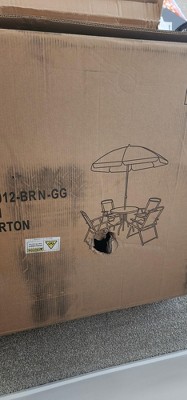 I was skeptical based on the reviews, however I just wanted something simple and inexpensive. To my suprised it was delivered all in one box. The chairs are really strudy although if you have hips it may be a little snug. The table was a easy set up, it took make 10 min to tighten up. The tool provided wasnt all that great but did the job nonethless. For our first outdoor table, chairs, and umbrella I'd say it does its prupose. The tan color is nice and the tilting feature of the umbrella allows for shade in any part of my yard.