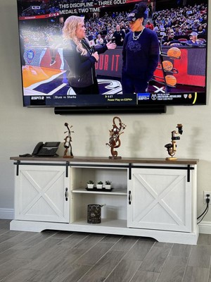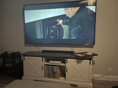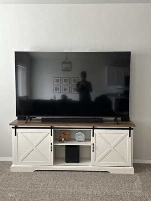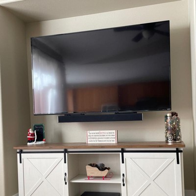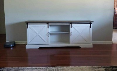 Saracina Home’s Clarabelle Double Sliding X Barn Door 70” TV Stand is the homey farmhouse pick-me-up you’ve been looking for. Two sliding X-front barn doors give you the freedom to choose what’s on display and what stays out of sight. Place media components, books, and decorations on any of the three adjustable shelves, and keep cables organized with the convenient cord management ports. Strong powder-coated steel hardware and accents add just the right amount of rustic finesse to the piece. The low profile makes for a down-to-earth silhouette that looks just right as a living room storage console or even a dining room sideboard.