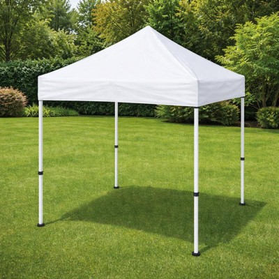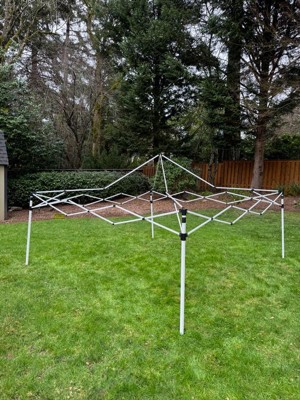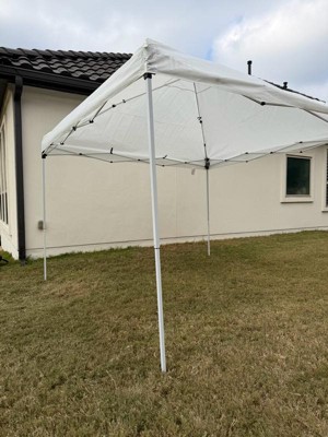 Don't let the blistering sun or a rainy day spoil your outdoor activities and events. This white all-weather 10' x 10' pop up canopy tent will keep you out of the elements so you can enjoy your time with family and friends. The polyester top is weather resistant to keep you dry in light rain, has reinforced corners to prevent ripping or tearing and is UV coated to resist the sun's rays to prevent fading. Simply unfold the fabric top, attach to the frame with the hook and loop fasteners, extend the bottom legs and pull open for instant protection. Get many years of enjoyment from this canopy tent. The white steel powder coated frame is rust and corrosion resistant and locks in place with a "pinch free" locking mechanism. The height adjustable frame takes you from the backyard to the beach and everywhere in between. This canopy pop up tent folds up when not in use and has its own bag for easy storage. This quick shade canopy includes the frame, canopy top and stabilizing ground stakes. Assembly takes less than 10 minutes and does not require tools. Take this portable shade canopy on camping trips, tailgating, the kids soccer games or for get togethers on your patio or in the yard. This party canopy tent will look great season after season. Additional Features: Height Adjustable Powder Coated Frame is weather and rust resistant, Assembles in 10 Minutes or Less; Includes Ground Stakes to anchor the structure; String Size (8): 118", Seating Capacity with 8' Folding Table: 10; Standing Capacity: up to 20, All Occasion Pop Up Party Canopy Tent ideal for family reunions, neighborhood block parties, tailgating, camping or as shade on your deck or patio
