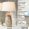 Refresh your decor with this pair of modern table lamps from the 360 Lighting brand. Each lamp features a free-form brown marble pattern crafted from cast resin that offers a natural elegant look. Up top are classic white drum shades. An ideal look for a modern rustic or western style room.