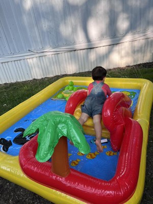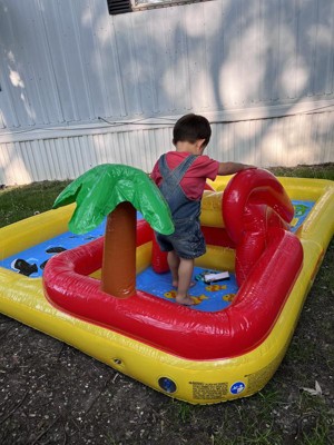 Intex's Ocean Play Center is an island of fun with a water slide, inflatable palm tree, turtle, whale, ring toss game, and a built-in sprayer. The water sprayer easily attaches to your garden hose for maximum convenience and is ideal to keep your little beach bums cool.