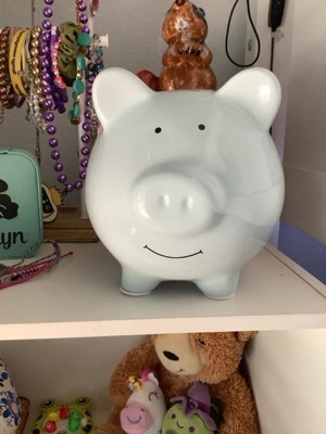 [This review was collected as part of a promotion.] The piggy bank in blue is adorable it's about the size of a soccer ball and has a light blue finish on it. It has a cute little face and a little curly tail on the back it's made of ceramic so it will break easily if it fell off a shelf or something. But it has a slit on the top of it to put your coins in and on the bottom had a little rubber plug so you can't easily retrieve your coins when you want them without having to break it open. It reminds me of a old classic piggy bank that they had when I was growing up but both my kids love it and it gives them a way to save up for something they want to purchase in the future overall a great idea and a cute piece to add to any child room.