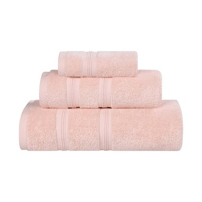 Refresh your shower space with the Latham 3-Piece Zero-Twist Towel Set. Crafted with premium Cotton, the two-ply construction makes these towels just as long-lasting and durable as they are stylish. This charming set includes 1 bath towel, 1 Hand towel, 1 washcloth in an assortment of solid colors. Featuring crisp, hemmed edges and a detailed chevron border, this gorgeous set is sure to elevate the beauty of your bathroom and give you a look you'll love.