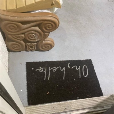 A: The doormat features the phrase 'Oh, Hello' in white letters on a black background.