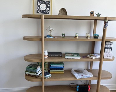 Display all your literary jewels in one place with this Portola Hills 5-Shelf Horizontal Bookcase from Threshold™ designed with Studio McGee. This wooden bookshelf features an airy design with five oblong shelves for organizing all your cherished hardbounds, classic novels, contemporary bestsellers and magazines, as well as potted plants, collected curios or framed photos. In a wooden finish, this five-tier bookshelf instantly elevates your room decor.