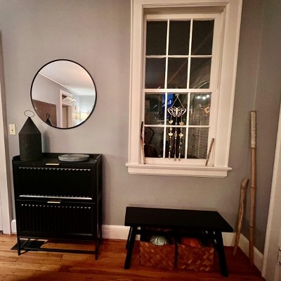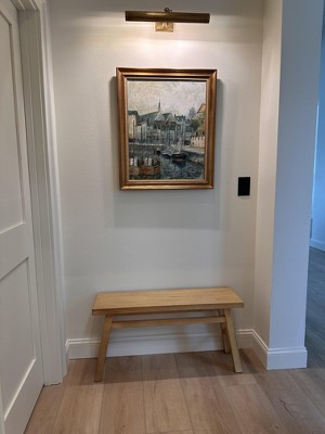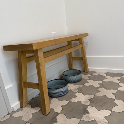 I searched forever for the perfect size, color, design and height and this met all my criteria. It’s perfect for a small entryway/mudroom! It’s the best neutral, light oak wood color, making it so versatile for a variety of decor styles. It makes a great stool to sit on and put on/tie your shoes. Since I’m constantly switching purses, I love to put the purse I’m currently using on it by the door, making it easy to find and grab on my way out! One of my favorite things is the design put into the height of the bench. I can fit my dogs’ water bowls underneath it and they have plenty of room to drink from them (and they’re big dogs!) Oh, and it came fully assembled! Definitely recommend for any small space in any room of your home!