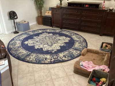 I bought it 2 weeks ago .It is navy blue but the distressed effects give it a royal blue look.I bought it to replace beige rugs The color works well with my gold and silver furniture.I bought both a circular and rectangular rugs and added padding for a plusher feel since the rugs are a little thin.Nice quality look for the money .I love blue so these just set it the glam,lux ,peaceful feel in my rooms.