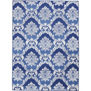 In a striking balance between rustic and elegant, this Whimsicle Collection area rug channels classic French country charm with its oversized damask pattern. A subtly distressed patina in a neutral blend of blue, grey, and ivory creates a comfortably lived-in effect that is at once welcoming and pleasing. Machine made of soft polyester with a low profile for a seamless fit under your sofa, dining room table, or near areas that need door clearance.