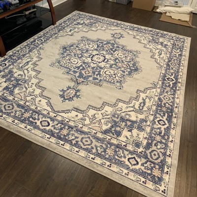 Rustic meets chic in this transitional area rug from the Whimsicle Collection. Inspired by 17th century Persian artistry, scrolling florals surround a classic center medallion design. On-trend grey, blue, and ivory tones are a versatile complement to French country, boho chic, and farmhouse styles of décor. This low-profile design is machine made of soft, easy to clean polyester fibers.