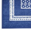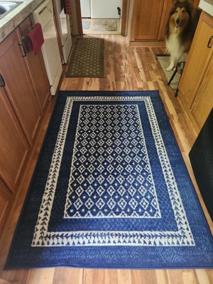 With its simple geometric patterns and double border, this Whimsicle Collection area rug brings an eclectic vibe to your surroundings. A neutral palette of navy and ivory with distressed accents add a softly antiquated finish to bohemian decor. Machine made of soft polyester with a low profile for a seamless fit under your sofa, dining room table, or near areas that need door clearance.
