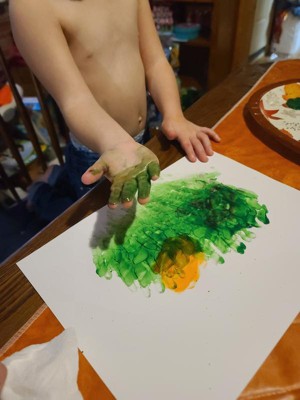 [This review was collected as part of a promotion.] Fun paints for finger painting or with a brush. Colors mixed nicely to make other colors. Washable of course which is good because I got green paint on my clothing and it washed out with no problem.