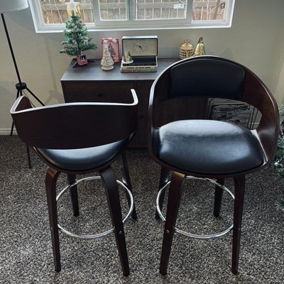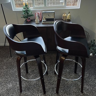 Pair your interior space with a seat that will upgrade your decor with effortless grace. With refined wood and delightfully upholstered seating, our barstool creates an exquisite mid-century modern appeal that also brings incredible function to your kitchen nook or home bar. This barstool is complemented by a beautiful bentwood frame, creating a durable structure that ensures stability for you and your guests. Finished with a convenient swivel function and a sleek foot rail, this barstool offers a sophisticated design that enhances the style of any home.