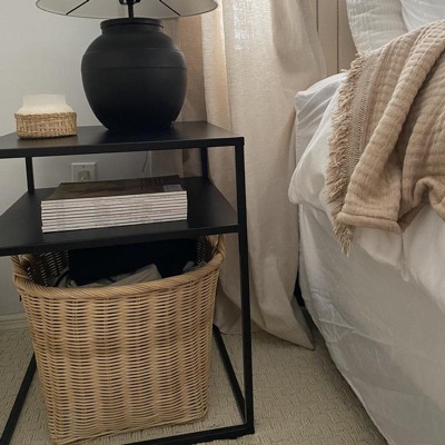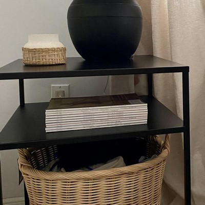 Add sleek, modern style to your space with this Glasgow Metal End Table from Threshold™. Crafted from metal in a solid hue, this end table sports a clean silhouette and a rectangular tabletop for a sleek look that instantly elevates any setting in your home. The end table features a spacious tabletop to display your favorite decor, along with a lower shelf to provide additional storage space you'll appreciate. Place it next to your sofa in your living room or alongside your chair to rest your book, cup of tea, small potted plant or a lamp.