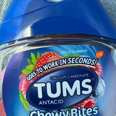 TUMS Chewy Bites Chewable Antacid Tablets go to work in seconds to make heartburn relief simple and delicious. When symptoms occur, take two to four chewable antacids, depending on the severity of your acid indigestion. Featuring the active ingredient calcium carbonate, these chewy antacid tablets relieve heartburn, sour stomach, acid indigestion and provide upset stomach relief associated with these symptoms. Each chewable antacid tablet delivers fast relief in every bite. With a delicious outer shell and soft center, these TUMS Chewy Bites come in three delicious assorted berry flavors. TUMS is the #1 recommended adult antacid brand by doctors, pharmacists and OBGYNs. As America's #1 antacid and trusted as a heartburn medicine for 90 years, TUMS is fully supported with a satisfaction guarantee. These calcium carbonate tablets are gluten free. These heartburn and acid indigestion relief tablets come in a compact, recyclable bottle that's easy to stow for whenever heartburn strikes. With TUMS Chewy Bites, you get a tasty way to fast heartburn relief in every chewy bite. *#1 Doctor recommended claim based on IQVIA survey, 2024 1. Consult with HCP on appropriate management of your GLP-1 side effects. Please consult with your HCP before taking this product and use as directed on label. Haleon does not sell, endorse, or promote use of any particular GLP-1 medication.