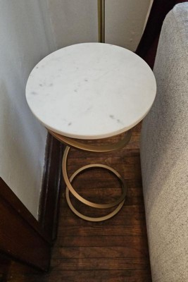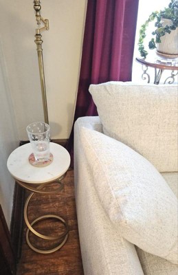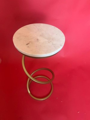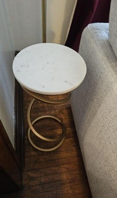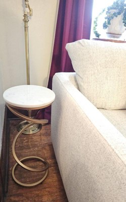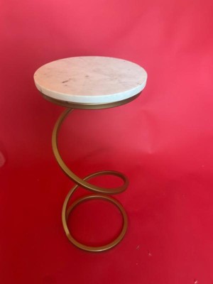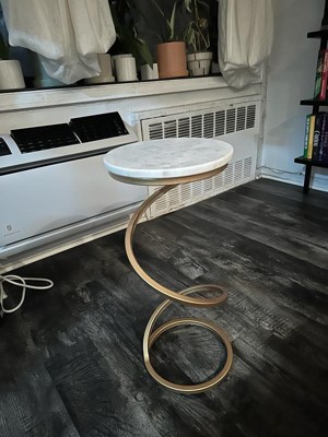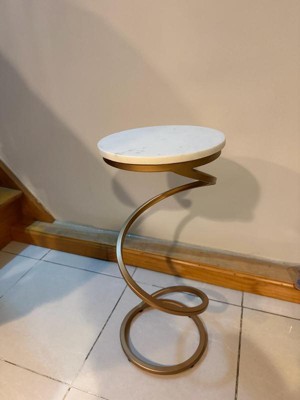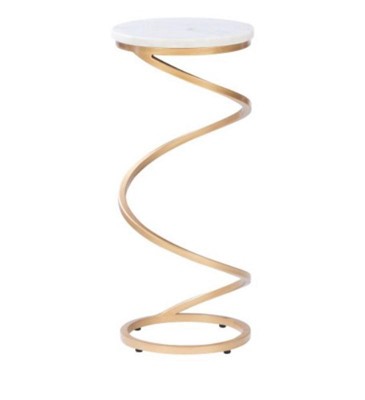 Spiral base white marble drink table adds whimsical accent to everyday living. More than just a place to set beverages, this simple yet stylish sassy side piece can sit by a chair, sofa, bath, bar or in any tight space. Prop candy dishes on top, books, candles, cappuccino, or family pictures. Use as the go to spot for your TV remote, phone or showcase a vase with flowers. Gold curvy support is elegant and sophisticated. Adjustable levelers keep side table stable.