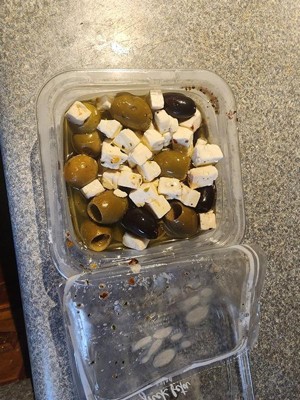Great taste! Excellent ratio of olives and feta. Makes a nice lunch or snack. Package is sealed very well for safety. A little messy when opening the seal but worth it.