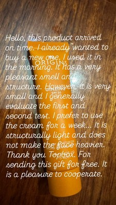 I tested it and really liked this product.. It was a very mini version of mine and I like to test it for about a week.. for the right result...it has a very pleasant smell and a thin texture. I recommend this product to all my friends. This product was sent to me as a gift Topbox circle