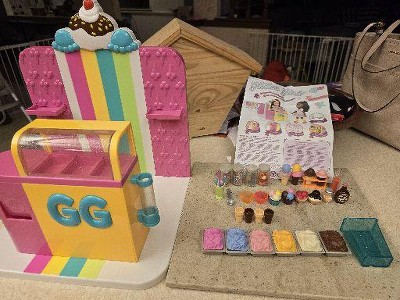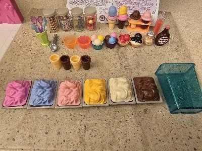 Missing Pieces Not 79 recieved someone Else's Return this has no Glitter Girl card labels or Signs or anything! Ice cream pieces scraped up missing paint. Need ice cream balls to scoop in bowls