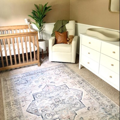 [This review was collected as part of a promotion.] We don't wear shoes at home and for us is very important to have rugs on the floor to keep our feet warm. This rug has a padding for the comfort and warmth. I use it in the living room and my son likes to play on it. The design of the rug reminds me of something vintage with a very subtle color patterns which makes it very versatile for any room and any style interior.