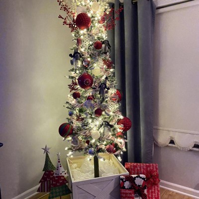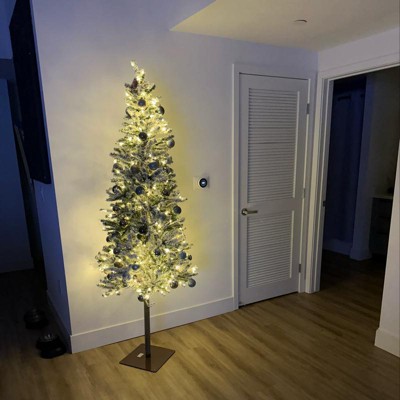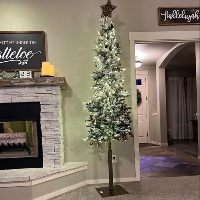 Celebrate the holidays with the Prelit Flocked Alpine Pencil Christmas Tree, featuring hundreds of warm white LED lights and a snow flocked appearance, to capture a festive, yet natural glow. Its slim, tapered design makes it ideal for small spaces or as an accent in larger displays. Flexible PVC branches mimic the texture of a real Alpine tree, while hundreds of branch tips provide plenty of room for ornaments. Assembly is quick and easy with a simple 3-step process, followed by fluffing for a full, natural look. A durable metal stand keeps the tree upright and secure all season long.