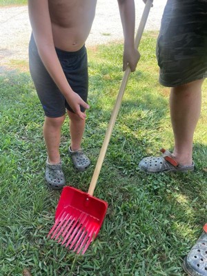 [This review was collected as part of a promotion.] Such a life savior! This really is a great thing to have if you have dogs or farm animals. The teeth of the end make it easy to comb through sand, grass etc. to easily move the debris. I am a little concerned about it being plastic but it seems to be very durable and strong.