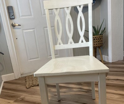 I liked these chairs for the price I paid. They are heavy and sturdy chairs. However, I wanted white chairs. They are not white at all. They are a cream or ivory color. Picture is for reference with my white door.
