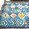 Moroccan influences abound in the colorful geometric design of this rug. Cheerful colors create a lively medallion design against a deep teal blue background. Add graphic impact to a modern room, or make this rug part of your Boho-chic story.