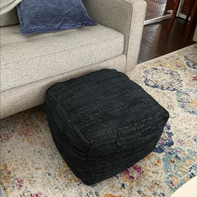 The woven leather gives it the perfect texture for my rustic living room. The size is perfect for our small space and the black color shows no dirt. It's sturdy enough to use as a footstool or to place a serving tray for snacks and drinks.