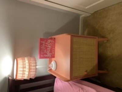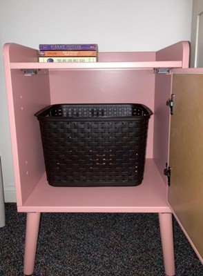 The Pillowfort pink rattan nightstand is unique. I think the rattan detail on the single door is different and fun. There is plenty of space inside the nightstand for storage, but it would be nice if there was at least one shelf inside. The door is easy to open and close, and I like the magnetic feature so that the door stays properly closed. The feet of the nightstand are cute and give the piece a retro vibe which I like. I appreciate that this piece of furniture is wood. However, the nightstand is not too heavy making it easy to pick up and move. I am disappointed with the paint job. There are sections along the top, around the short wall that seem yellow. Also, I would personally prefer if the pink was lighter.