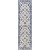 Meticulously designed based on vintage oushak rugs, this design grounds any space with elegance and sophistication. The border of blue and the floral motif throughout lend a tradition ground on which the monochromatic color offers a modern update. Power loomed from synthetic materials, it is as durable as it is beautiful.