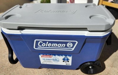 The Coleman 316 Series Insulated Portable Cooler is perfect for any outdoor adventure or gathering. With its heavy-duty 6-inch wheels and tow & swing-up handles, it is designed for easy transport, making it great for camping, picnics, tailgating, and any other outdoor activity. This fully insulated cooler has a lid and body designed to keep the ice for up to 5 days in temperatures as high as 90°F, making it an ideal choice for longer trips or events. The have-a-seat lid is a unique feature of this cooler, as it can support up to 250 lbs., allowing you to use it as an extra seat in a pinch. The molded cup holders with drain built into the lid make it easy to keep your drinks from spilling, and they can even fit up to a 30-oz. tumbler. The cooler's interior is spacious, with the ability to hold up to 160 cans to bring all your favorite drinks and snacks. The stain-resistant liner makes it easy to clean up after use, and the leakproof channel drain plug ensures no unwanted spills. The recessed lip on the lid makes it easy to access the cooler's contents without any hassle, and the channel drain plug allows for easy draining of excess water. The overall design of the cooler is sleek and stylish, and the blue and white color scheme adds a touch of fun to any outdoor event.