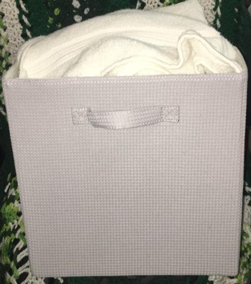 This is a cute and fairly sturdy storage cube; it's the standard size to fit most square bookcases/shelving. The fabric is a pale grey waffle-weave that's a great neutral, and it holds quite a lot of stuff (mine is holding extra towels). It comes flat and has to be expanded and the bottom put in place, but is also easy to fold back up if needed. My only issue was that the handles feel like they might not be super sturdy, so I'd suggest using it for lighter items like toys, blankets, towels, etc. rather than heavier items.