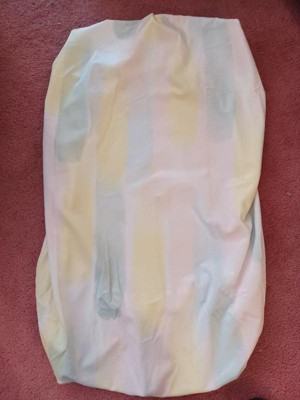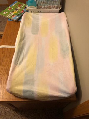 This changing pad cover is so cute, it is several pastel or water color like brushstroke colors. Its easy to slip on and off for being able to put in the wash and then put back on the changing pad, it would be perfect in any nursery or baby room.