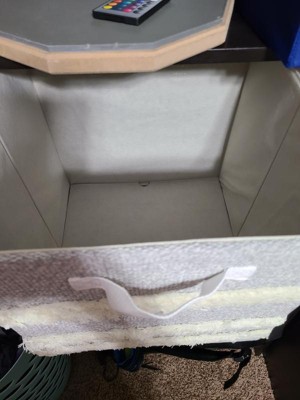 This Cloud Island Tufted Canvas Storage Cube is covered in a gray colored canvas with 3 strips of cream colored tufted material on the front, sides and back are solid gray. Securely sewn on cream colored handle located on both the front and back of cube, makes for easy carrying. Currently using in my son's room to keep small blankets in it as its nicely sized 13x13x13. Collapsible for easy storage when not being used.