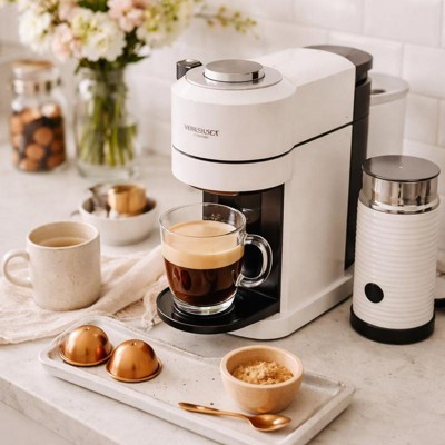 [This review was collected as part of a promotion.] The Nespresso Vertuo Next is super convenient for quick, high quality coffee at home. Setup was simple and the machine looks sleek in white. I love the variety of pod sizes and how consistently it delivers rich crema and great flavor. It’s perfect for busy mornings or when hosting guests. The only downside is that it can be little noisy and relies on proprietary pods, but overall it’s a great addition for anyone who enjoys cafe-style coffee without any hassle.