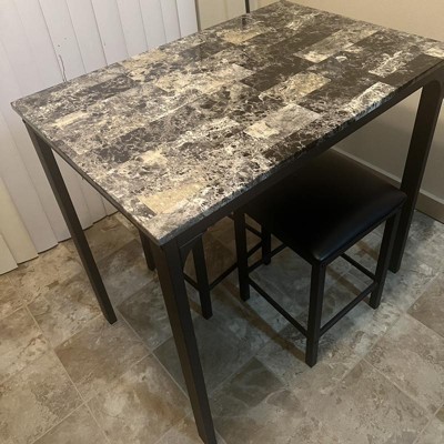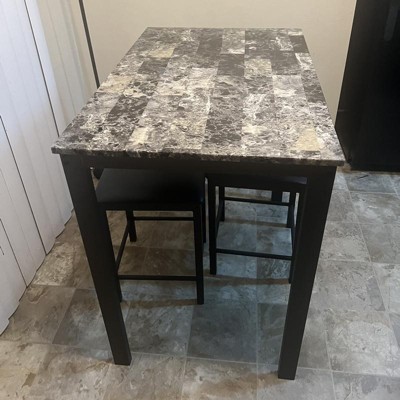 This is a nice table for a small space. The faux marble top is nice and so are the stools. Assembly was easy and all the tools needed to assemble are included.