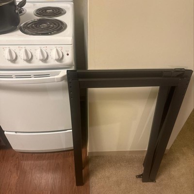 Bought the table specifically to hide my storage bins underneath in the kitchen and to get more counter space. Easily put together by myself using the picture diagram sheets; although 2 larger screws were missing it didn't effect the piece at all since there were already 1 large and 2 small pieces holding tight the leg portion. Looks beautiful and put it against the wall; had plenty of space to put my coffee maker and large toaster oven. Was able to have space to sit and eat too. I am buying another piece to extend the kitchen counter.