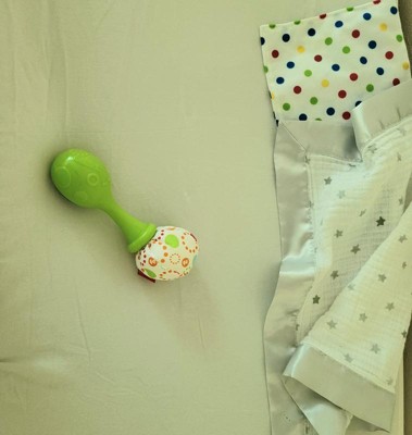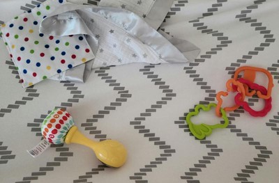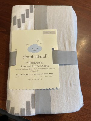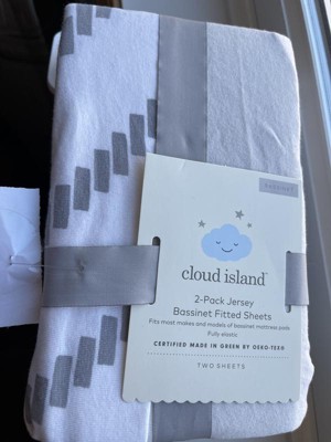 This Cloud Island Bassinet Sheet set is nice. It comes with two sheets. One has a gray chevron pattern and the other is solid gray. They are jersey sheets made of cotton and spandex. They wash well and are good basic sheets to have.